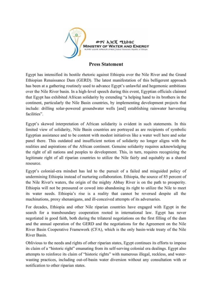 Ethiopia’s Ministry of Water and Energy has issued a statement responding to recent comments from Egyptian officials regarding the Nile River and the Grand Ethiopian Renaissance Dam (GERD), accusing Egypt of intensifying what it described as “hostile rhetoric” toward Ethiopia.