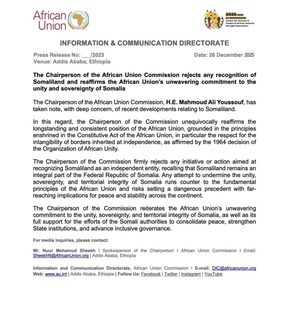 The African Union Commission has formally rejected any move to recognize Somaliland as an independent state, reaffirming that the territory remains an integral part of the Federal Republic of Somalia.