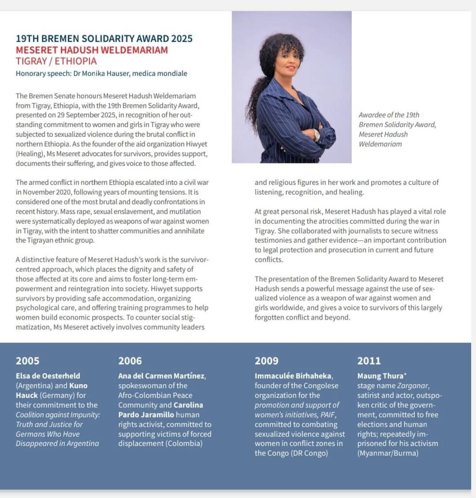 With this honor, Meseret Hadush joins their ranks—carrying forward a legacy of resistance, healing, and unwavering dedication to human rights. Her recognition is not only personal; it belongs to the women of Tigray, to survivors of conflict-related sexual violence across Africa, and to women worldwide whose voices are too often silenced.