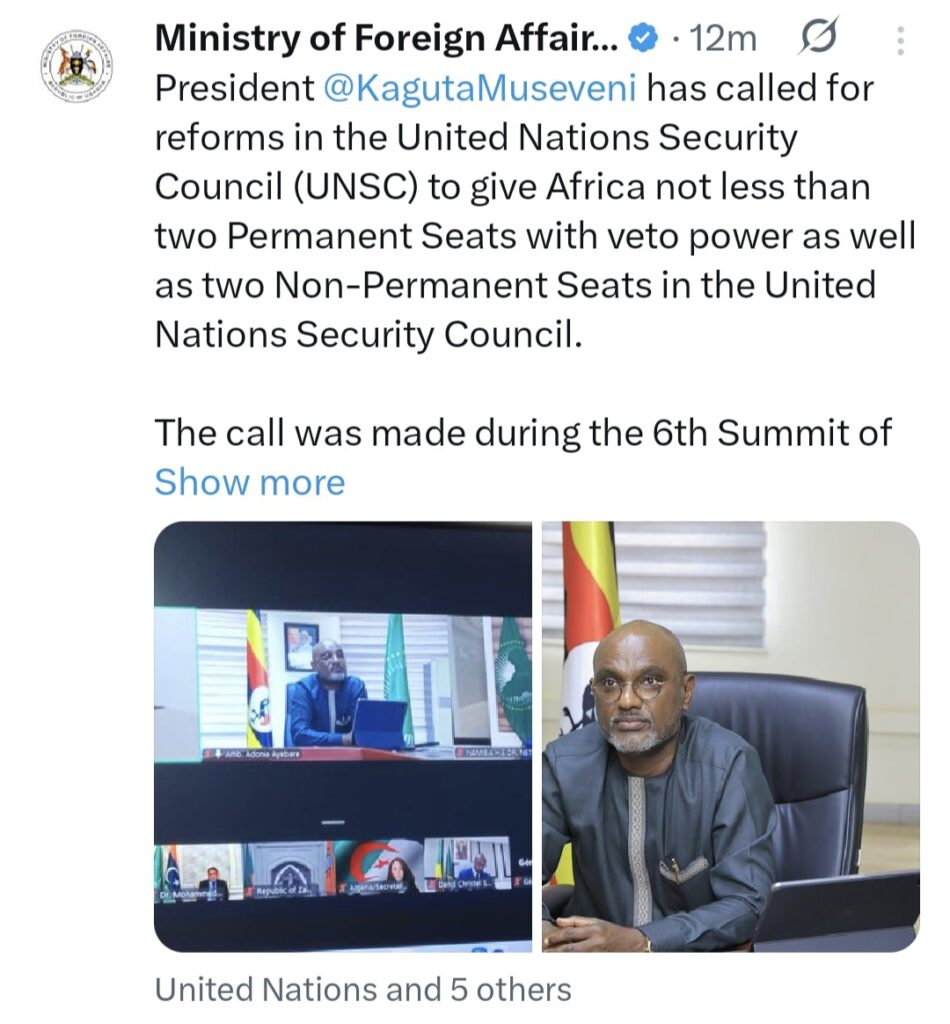 Uganda’s President Yoweri Kaguta Museveni has renewed Africa’s long-standing call for structural reforms at the United Nations Security Council (UNSC), demanding that the continent be granted at least two permanent seats with veto power, in addition to two non-permanent seats.