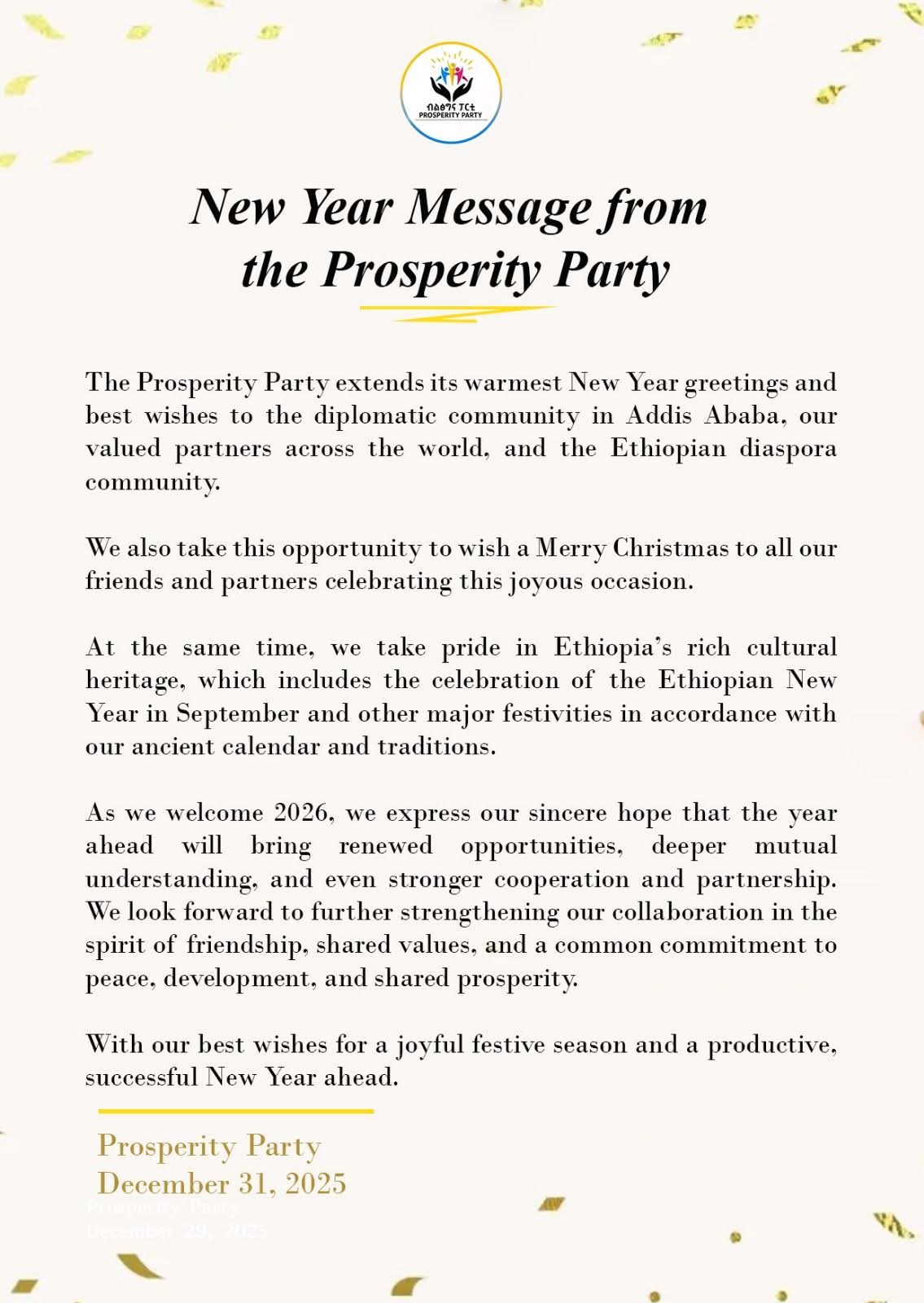 According to a post on its official Facebook page, the Prosperity Party has extended New Year greetings to the diplomatic community in Addis Ababa, international partners, and the Ethiopian diaspora. The post also conveyed Christmas wishes to those celebrating the holiday.
