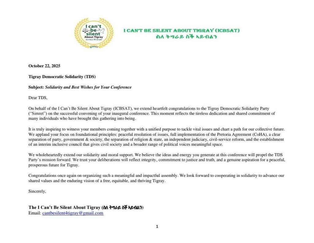 Similarly, the I Can’t Be Silent About Tigray (ICBSAT) movement, in a statement issued on October 22, 2025, welcomed the TDS’s commitment to peaceful dialogue, full implementation of the Pretoria Agreement (COHA), separation of party and government, and the establishment of an independent judiciary. The movement described the conference as “a sign of integrity, justice, and the genuine aspiration for a democratic Tigray.”