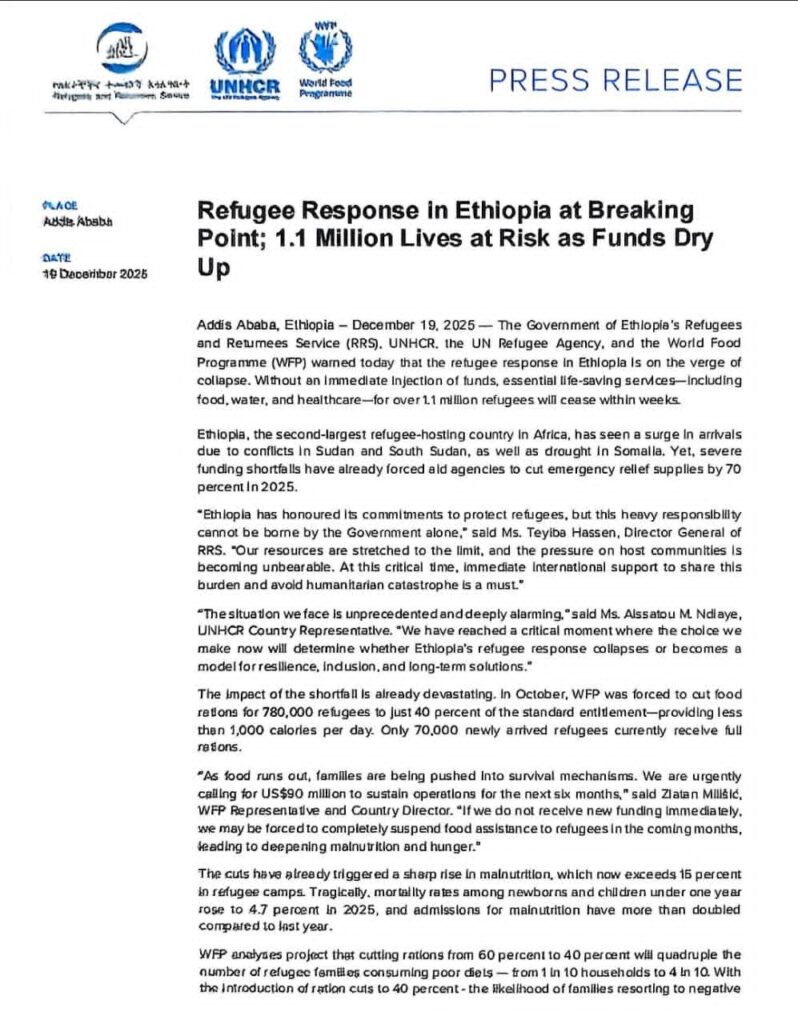 Addis Ababa, December 19, 2025 — Ethiopia’s refugee response is facing a severe crisis, with humanitarian agencies warning that life-saving services for more than 1.1 million refugees could halt within weeks due to critical funding gaps.