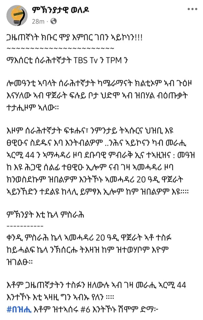 In a serious blow to press freedom in northern Ethiopia, six journalists and media workers from TBS TV and TPM were arbitrarily detained on Saturday while on assignment in Southern Eastern Tigray. The team was traveling from Mekelle to Mekoni to cover a planned public demonstration but was intercepted and detained in Wajerat before reaching their destination.
