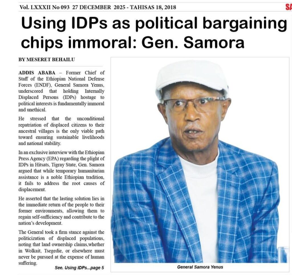 Addis Ababa — Former Chief of Staff of the Ethiopian National Defense Forces, General Samora Yenus, has described the use of internally displaced persons as instruments of political bargaining as immoral and unethical, calling for their unconditional return to their places of origin.